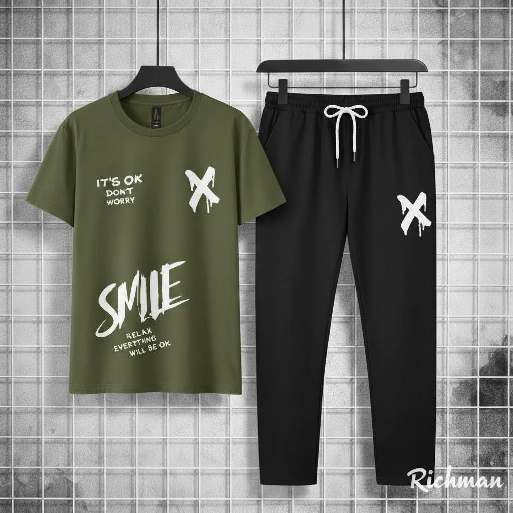 Men Grey Printed Sleeve Track Suit Set Summer Cotton Slim Fit